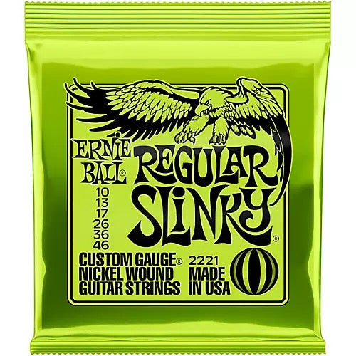 Also known by their Ernie Ball model number, 2221, Regular Slinky strings come in a Custom Gauge set: .010, .013, .017, .026w, .036 and .046. Favored by many guitarists around the globe, Regular Slinky wound strings are made from a nickel-plated, steel wire wrapped around a hex-shaped, steel core wire. The plain strings are made of specially tempered, tin-plated, high-carbon steel, producing well-balanced tone for your guitar. Musician's Friend customers have long appreciated the value Ernie Ball Slinky strings provide. Regular Slinkys offer classic tone and feel, but they're also long lasting, particularly for uncoated strings.